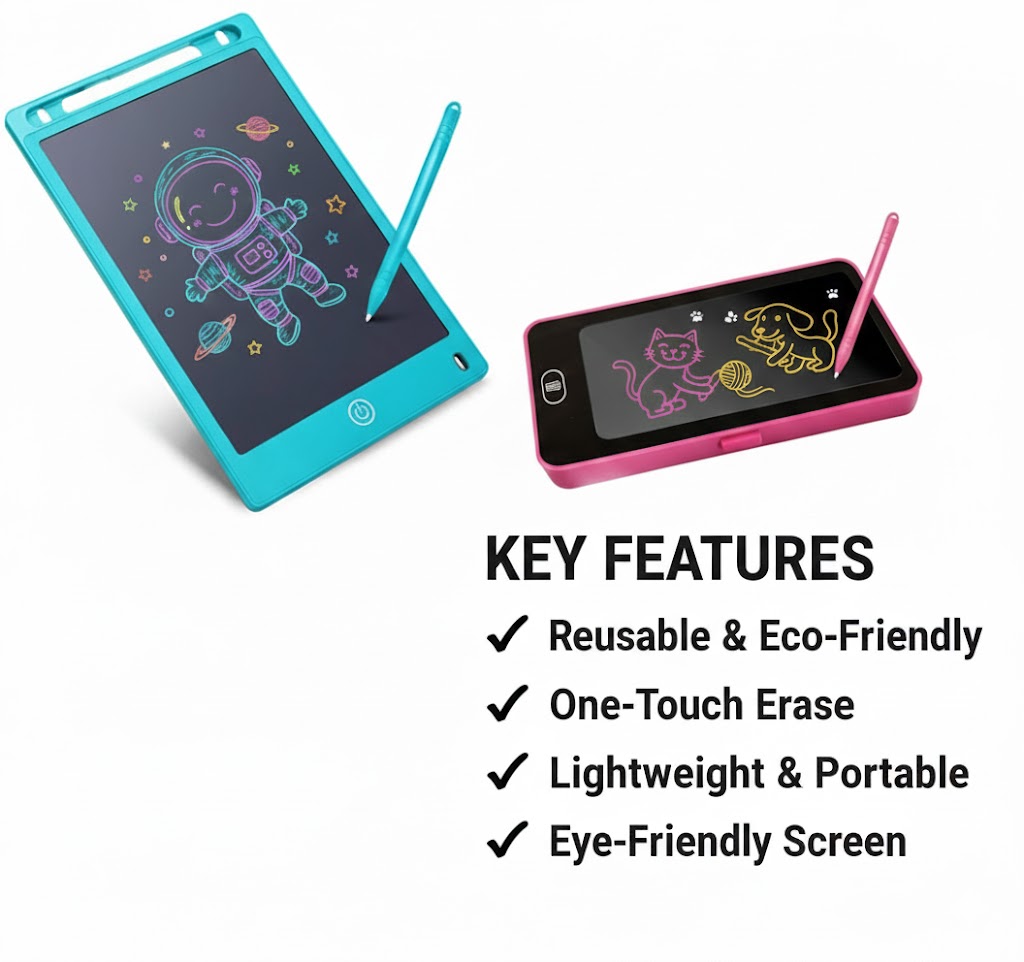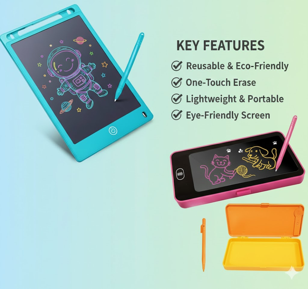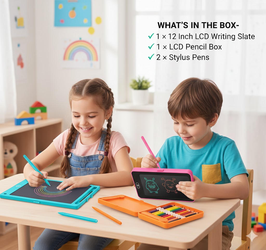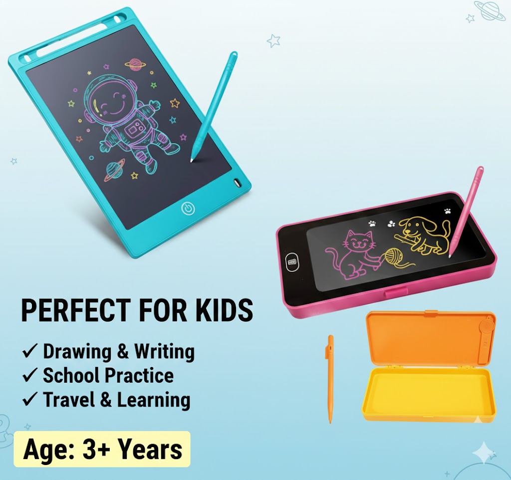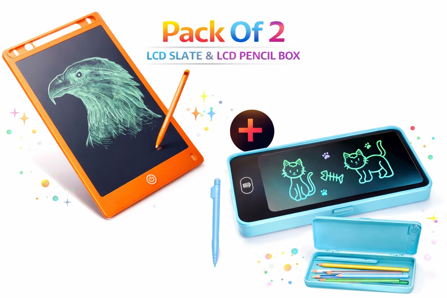 LCD Writing Slate & LCD Pencil Box Combo for Kids is a fun and educational stationery set designed for daily school use and creative play. The reusable LCD slate allows kids to write, draw, and practice without paper, while the spacious pencil box keeps all stationery neatly organized. Perfect for school, home learning, travel, and birthday return gifts.