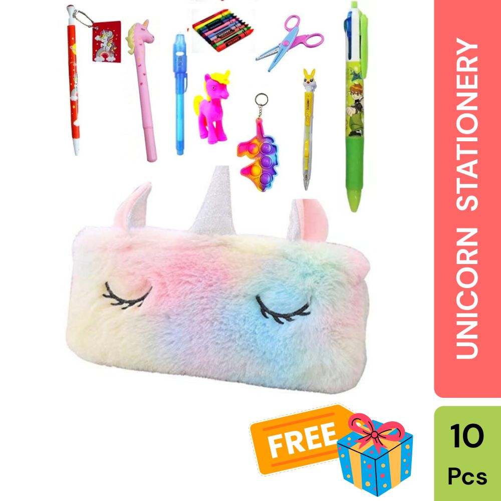Adorable unicorn fur pouch filled with 10 premium fancy stationery items — perfect for school, gifts, and return parties!