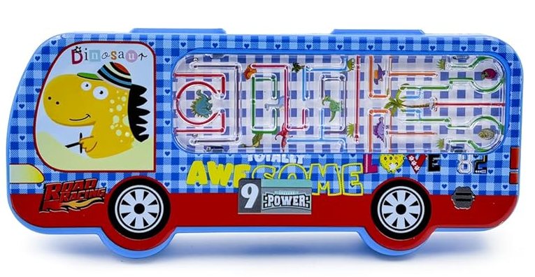 - Whimsical Design: This maze racer pencil box features a vibrant, eye-catching design inspired by a stylised bus with colourful graphics and a cartoon character.