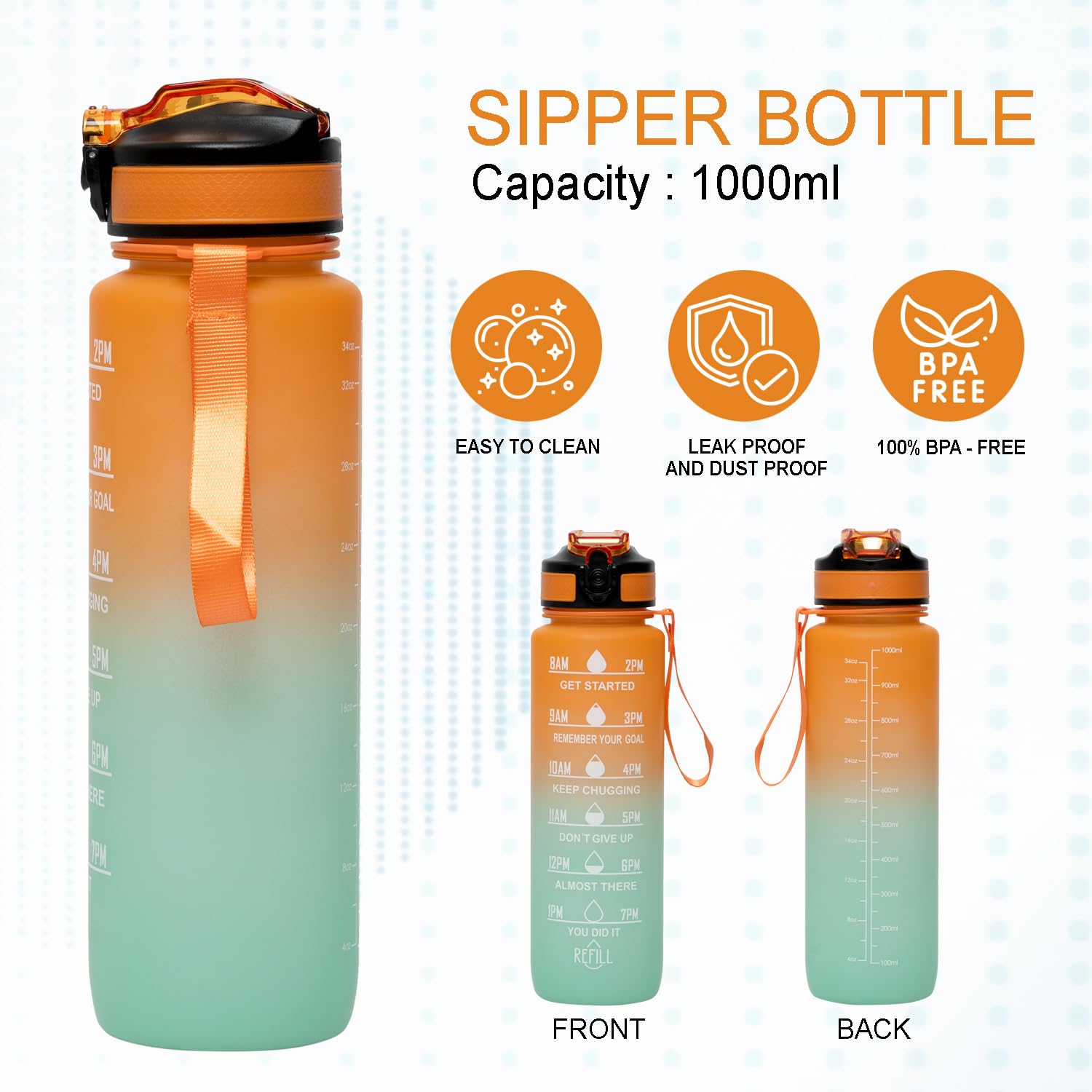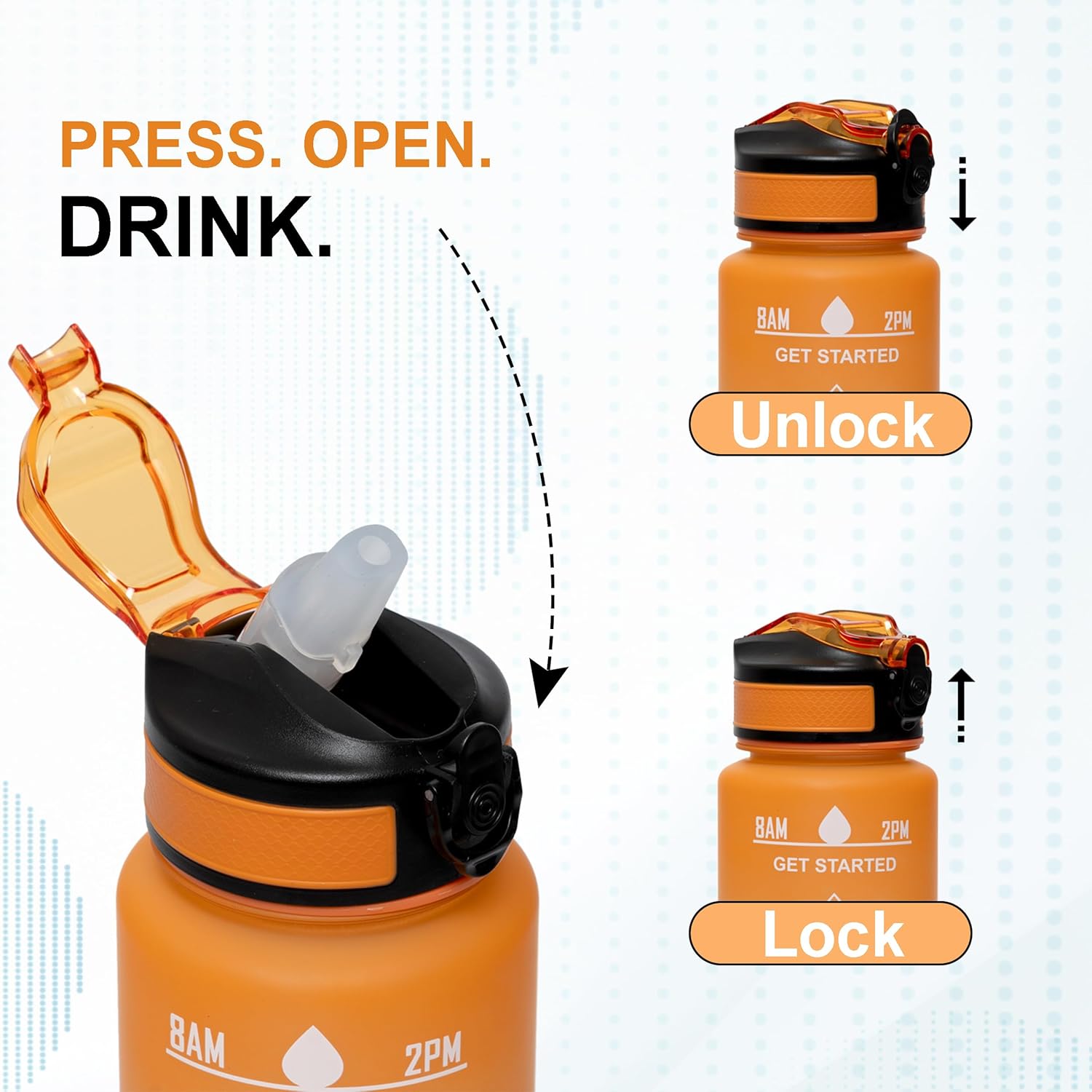 This 1100ml motivational water bottle is your perfect hydration partner, featuring clear time markers to track your water intake throughout the day. Made with durable, BPA-free material, it comes with a secure flip-top lid and straw for easy sipping. The leakproof and lightweight design makes it ideal for gym workouts, office desk, travel, or home use. Its motivational quotes inspire you to achieve your daily water goals while staying healthy and refreshed.