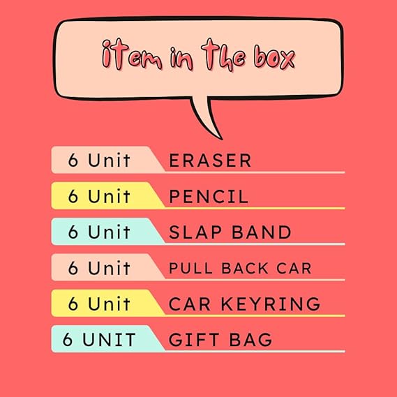 Make your child’s birthday unforgettable with the Utsub Car Theme Return Gift Combo Pack – a thoughtfully curated 6-set stationery collection, designed to delight boys and girls alike! Each set includes 6 premium items like mini car toys, car-shaped erasers, rocket pencils, colorful slap bands, LED car keyrings, and a vibrant gift bag.
