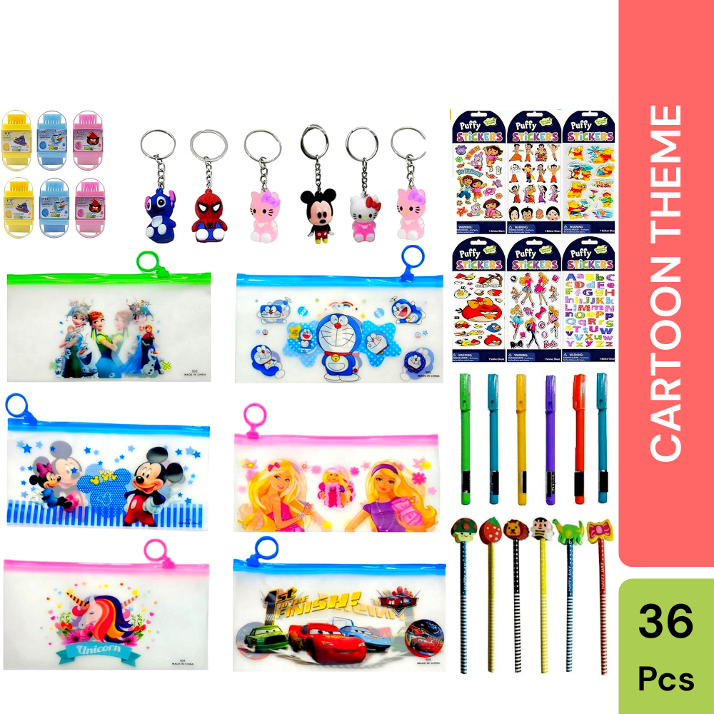 Fun & colorful Cartoon Theme Birthday Return Gift Set (36 Pcs) – Includes pouch, pencils with erasers, sharpener, pen, stickers & keyring. Ideal for kids’ parties & school use!